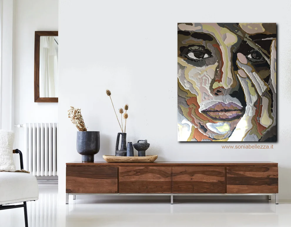 Dipinto materico a rilievo ricco di effetti di colore particolari ottenuti modellando con le mani una speciale miscela a base di gesso.